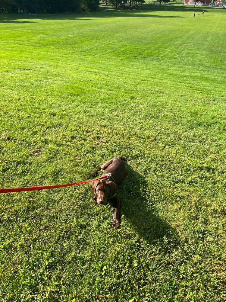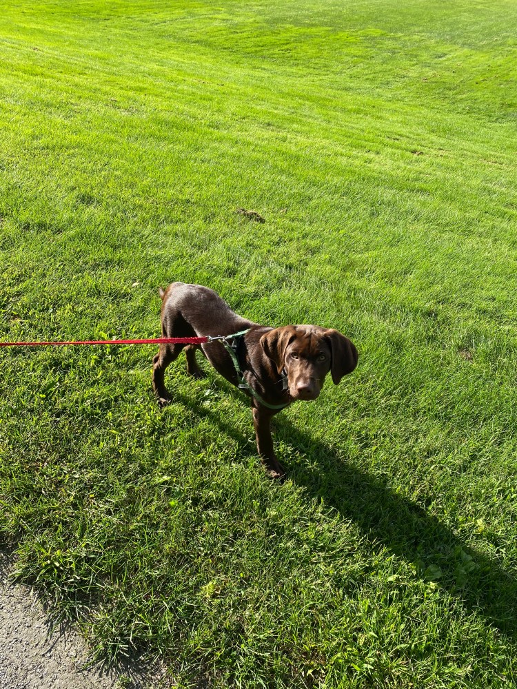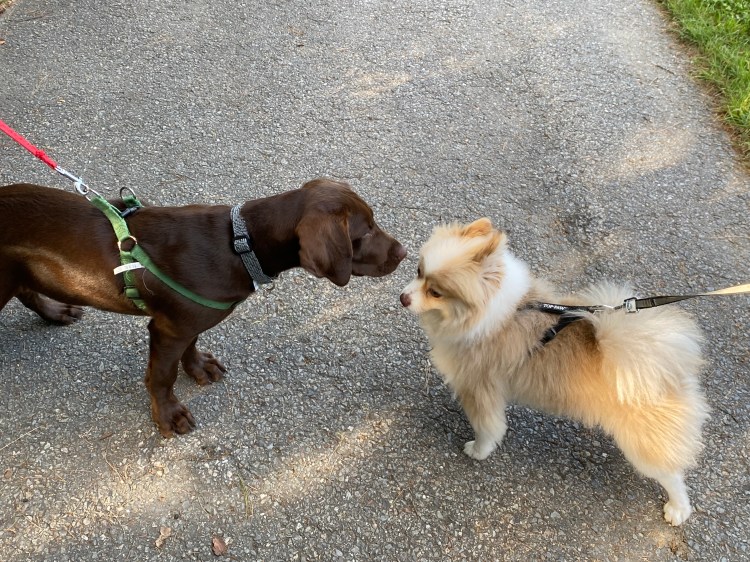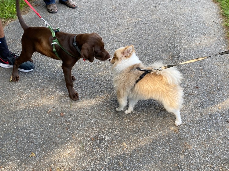 “Nice! there is so much more to explore here than the boring neighborhood road.. The gravel path, the lovely green grass, so many folks to jump on to say “Hi”. But these big dogs are kind of scary. What should I do? I can’t leave this bliss. So much to chew and munch on. Too much flavor to explore! Common let’s be a little brave and try to ignore them. May be they will not notice me… Now what is this? this guy is not even on leash! Let’s try to ignore him and start exploring the grass on this side. Looks like that worked. Woohoo! Now why did we stop here to say high to this one. He is as big as the previous one but atleast on leash.”