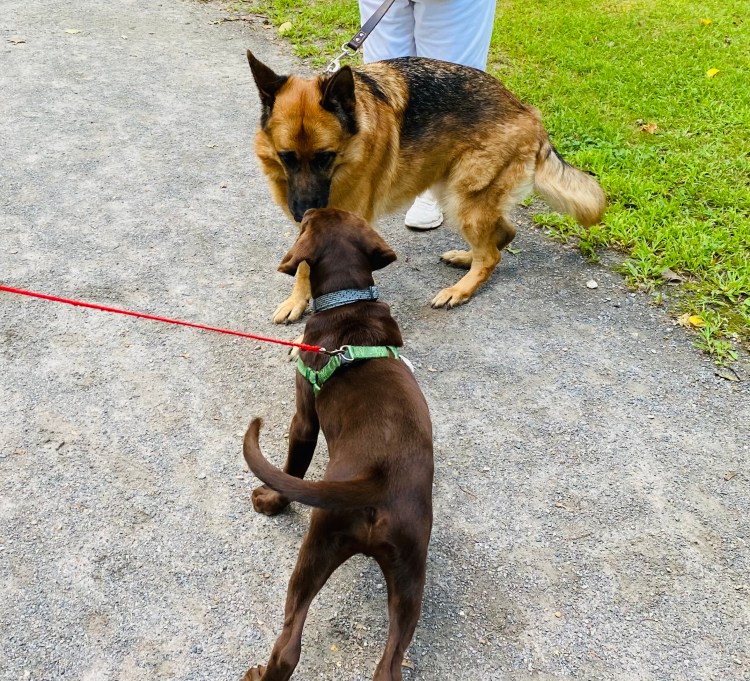 Well Rocky just couldn’t play his trick when two lovely pets stopped by to say hi to him and one of them was a big German shepherd. Rocky gathered all his courage and with some coaxing went forward and greeted her in the most sweetest way. It was a pleasure to see him socialize.