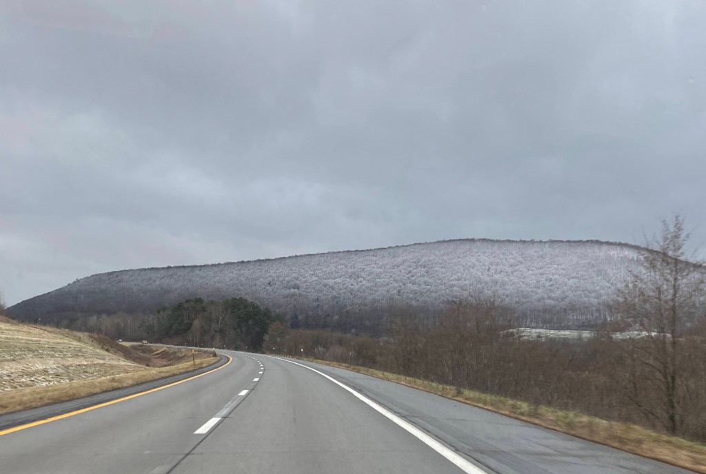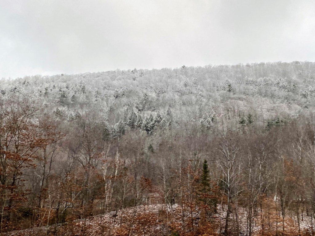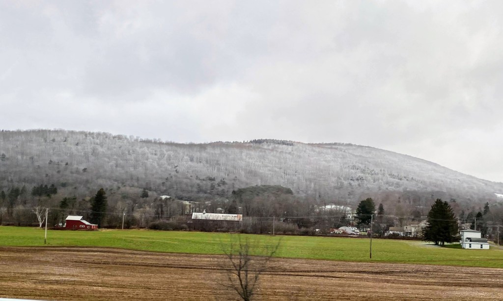 Nature has sprayed snow on the mountains. The light spray looks lovely and has a pristine beauty albeit the shades of gray. It will spray again if needed and the trees will shake them off with the gusty winds. However, all is not grey. You can still spot the red barns and green meadows.