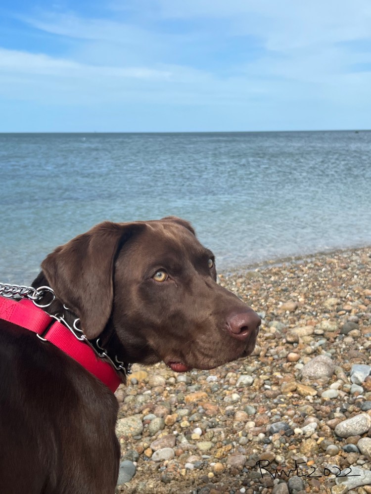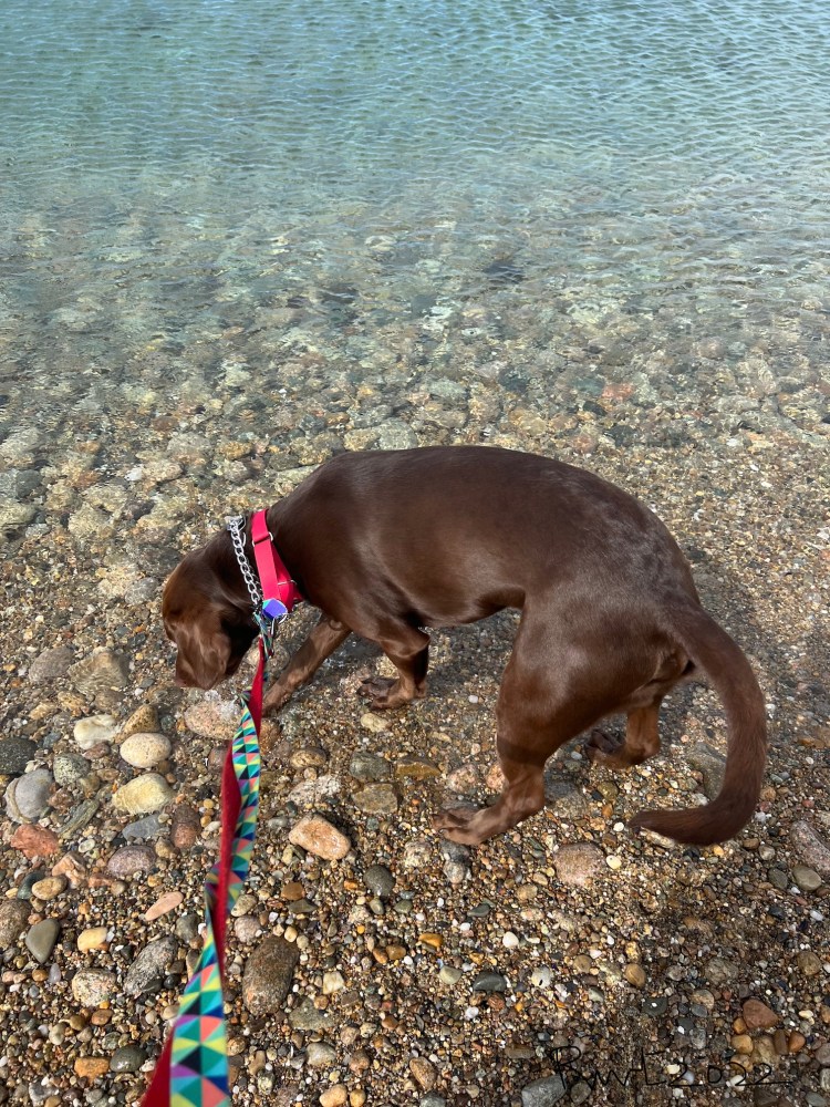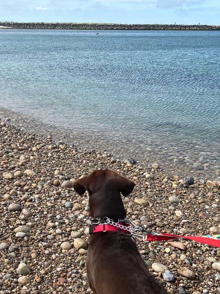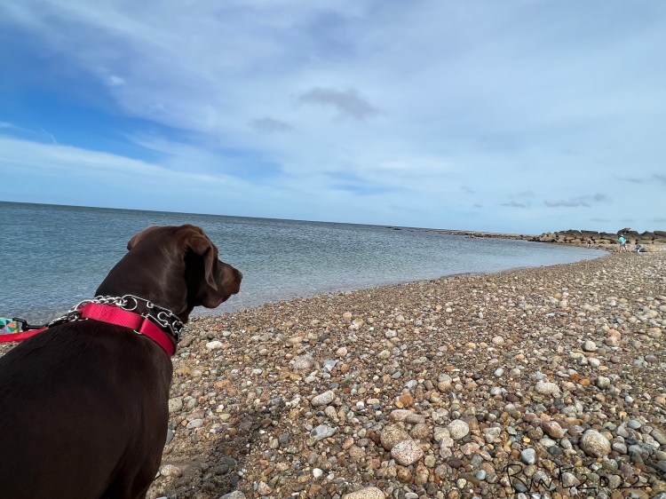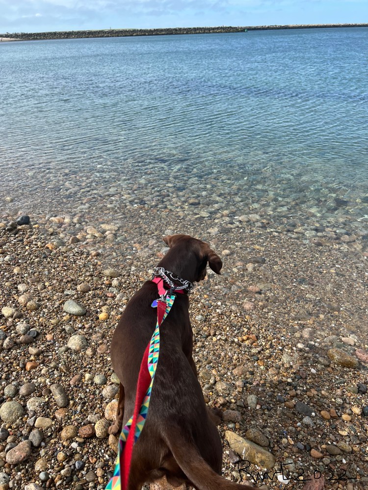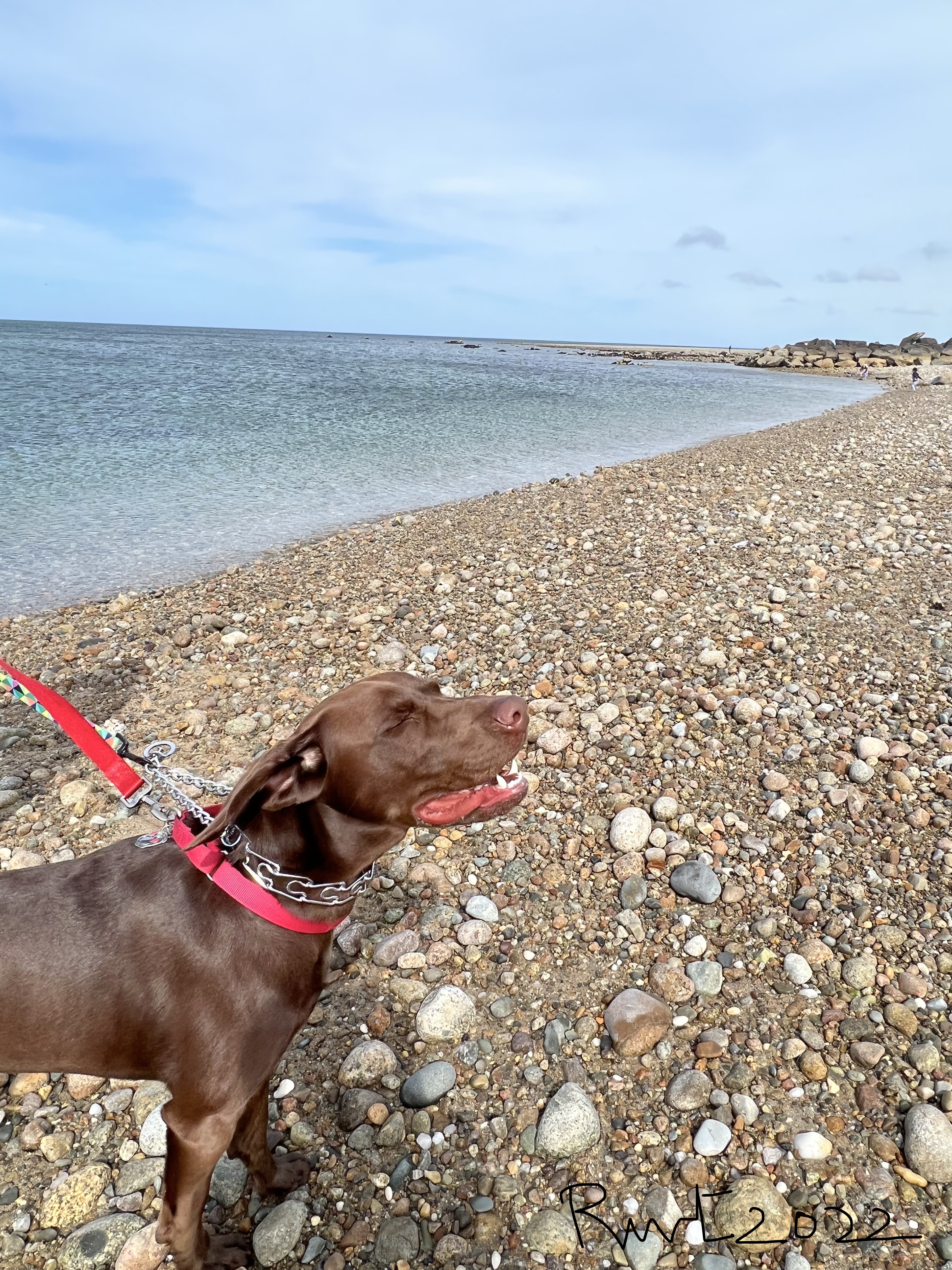 “Wow! where did we come? I smell other dogs and a fishy smell. What’s this grainy stuff ? this is not grass or the road. Nice! all stones and pebbles! Oh please don’t pull me, I promise not to eat ’em!”