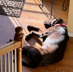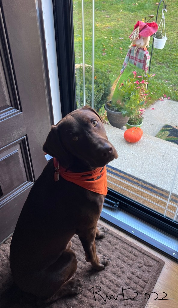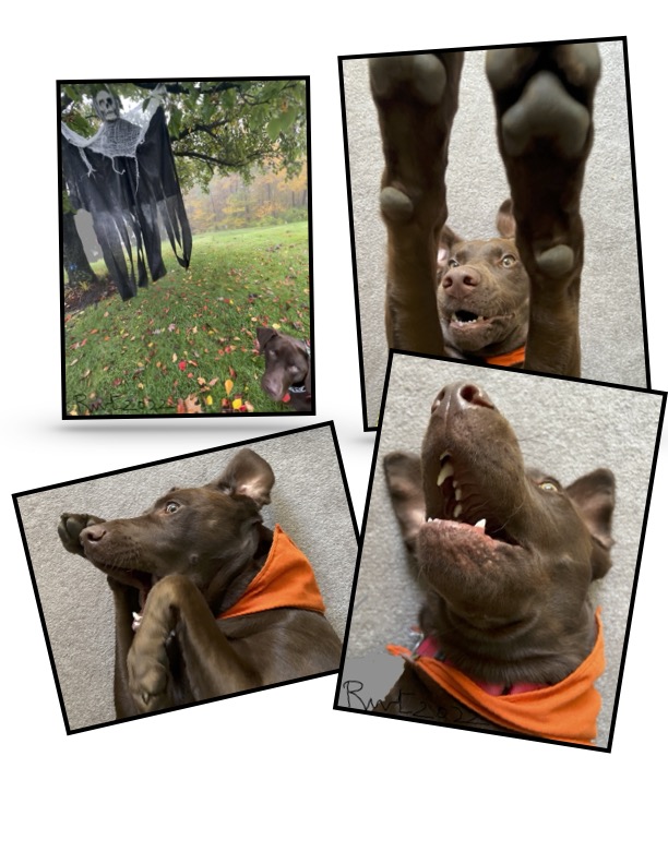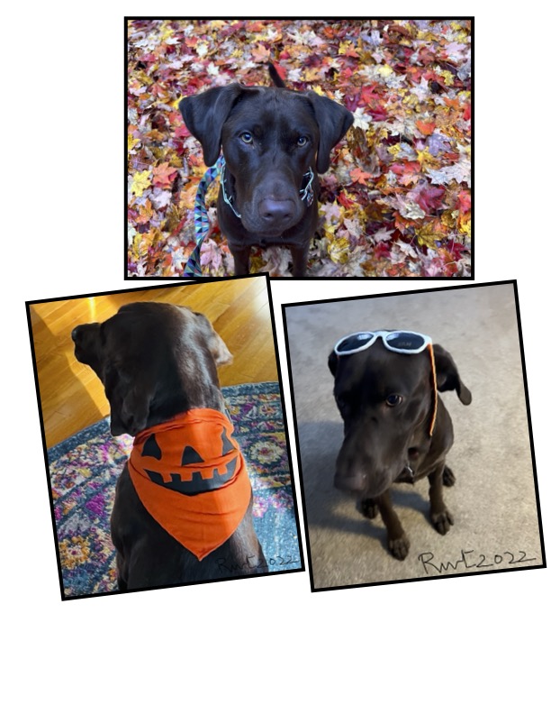 With all the Fall decor around, Rocky is super excited and looks around intently. His favorite is a hanging skeleton from a tree that he loves to explore everyday as it swings back and forth in the autumn wind . I felt he really wanted to be part of this autumn celebration and so I was not surprised when this super active lab readily wore a halloween dog collar bandana (though the wrong way away from his active mouth!), posed shyly with a prop (sunglasses) and the colorful Fall foliage as background. Like all dogs Rocky communicates beautifully with his eyes mostly and I am glad that I can understand him to give this cute little guy some joy in his life.