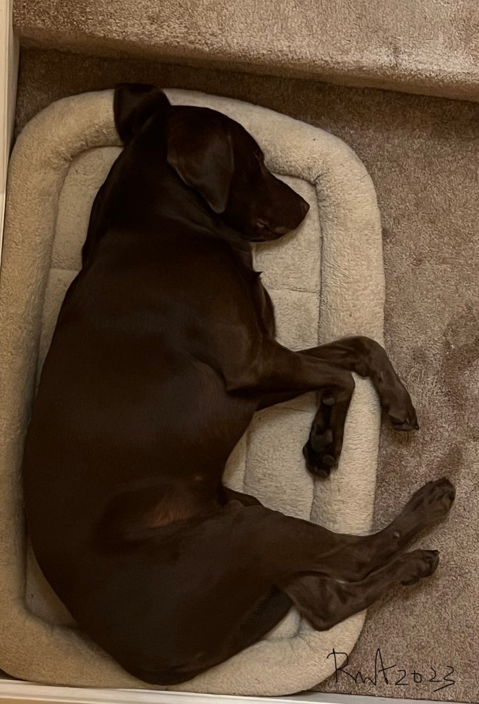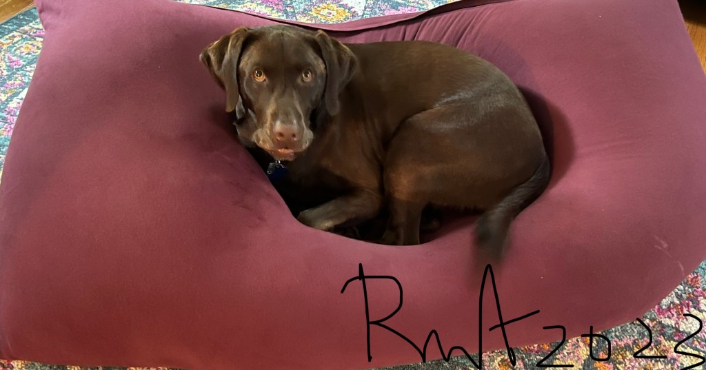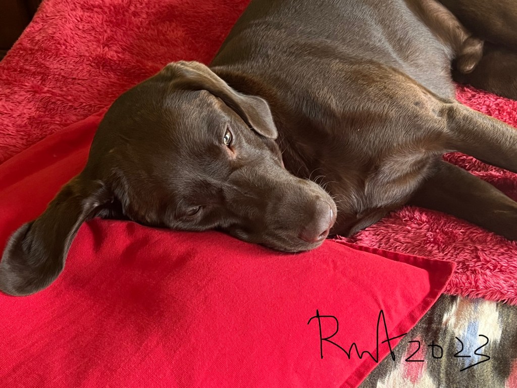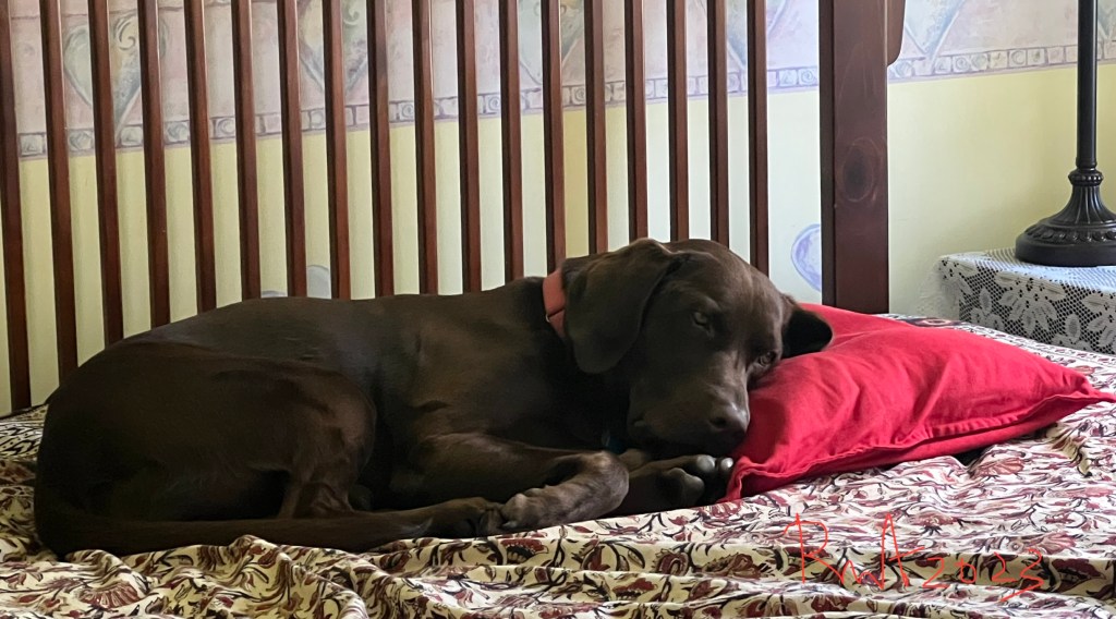 Graduating from his crate days to sleeping on his own bed, Rocky soon figured out that there are better places to take over. Since that day Rocky sleeps in the guest bedroom, on a flannel throw and a red pillow. I had noticed that he loves to copy us sleeping with our head on the pillow. He was so glad when he got one and I was happy to fulfill his wish! He also loves to relax on the Yogibo and often pushes me out of it. The 70+ lbs of weight rolling in different postures everyday, has made it totally flat now and in need of new beads!!!