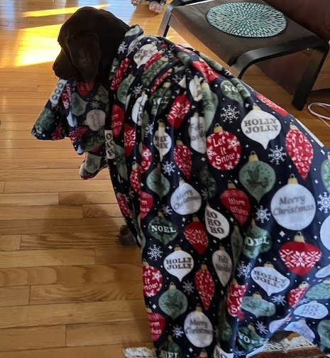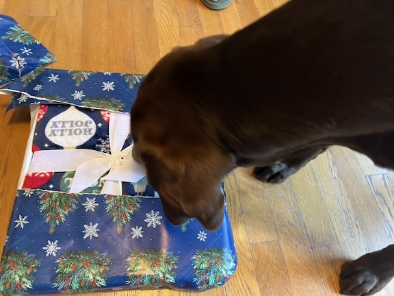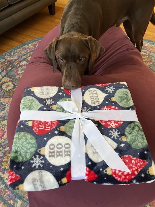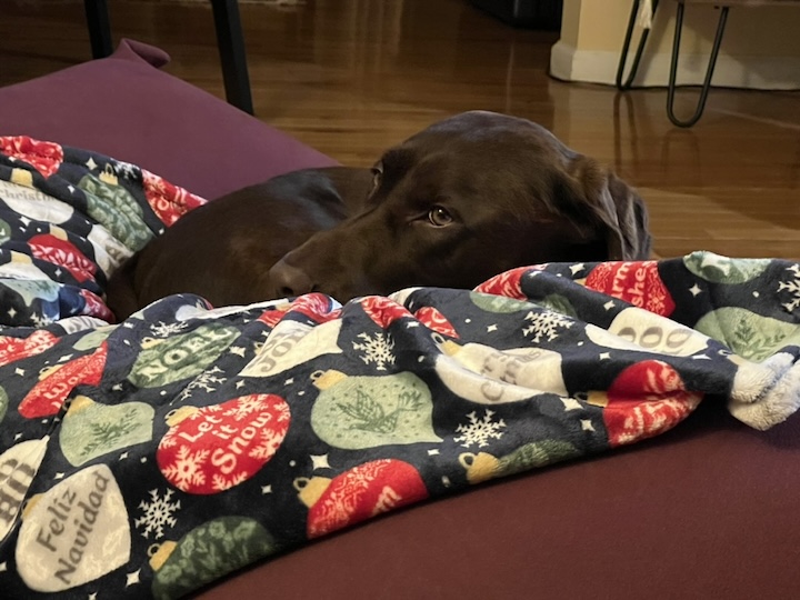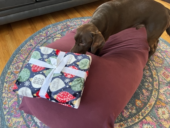 This year, we were greeted with snow on the ground on Christmas Day. Rocky had a wonderful time celebrating with his human family, and now he’s happily lounging, lazily spreading joy throughout these cozy days—mainly napping on his new blanket, perched on his favorite Yogibo.
